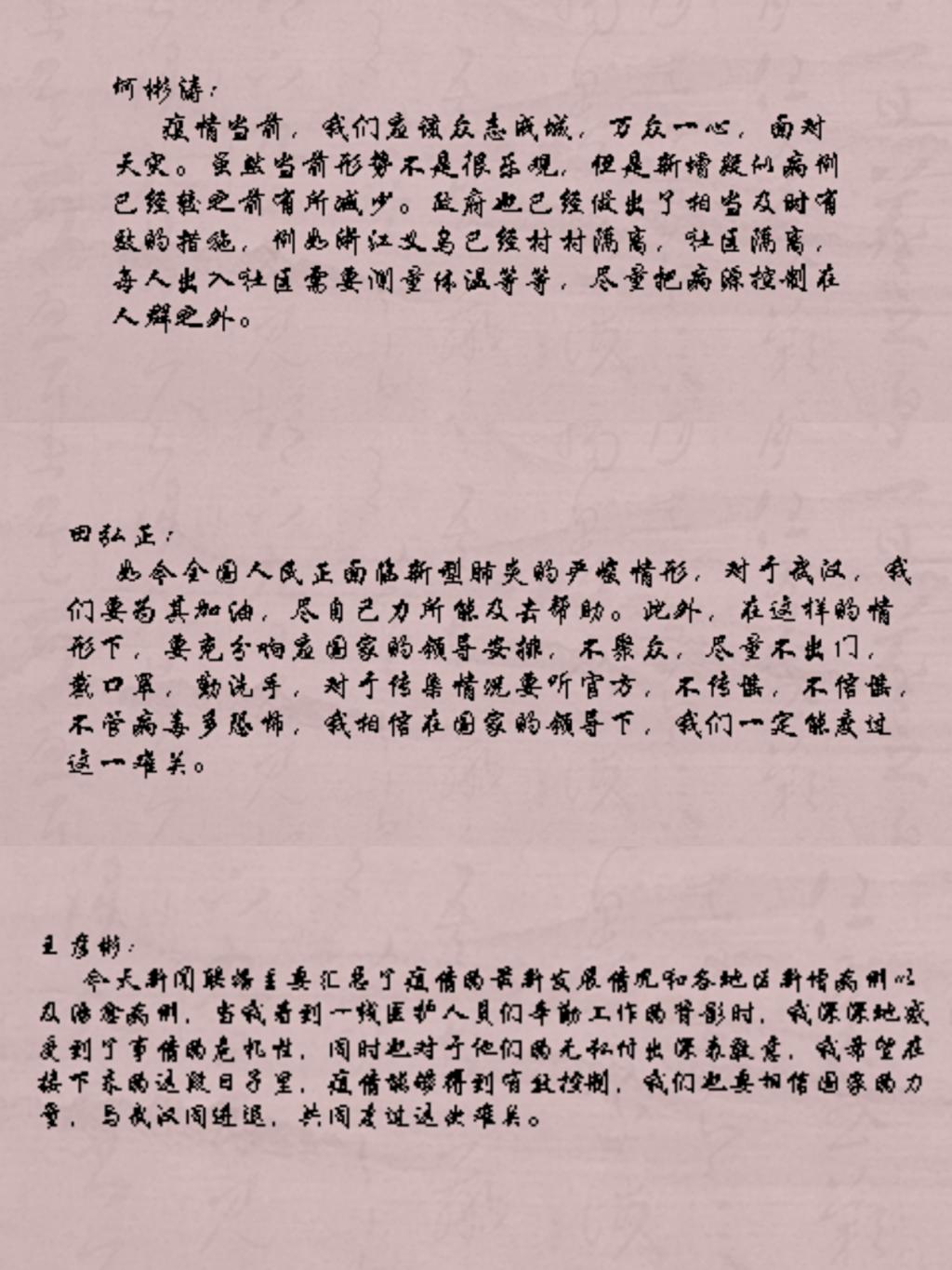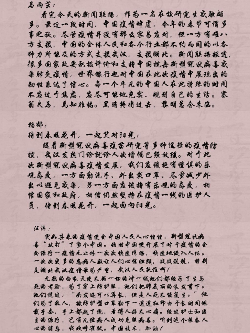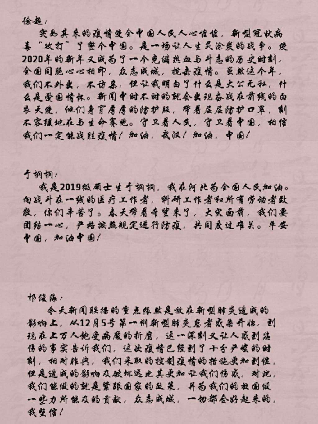 多样化开展系列教育活动。1月24日,中心开展“正确防疫,健康过节”教育活动,为全体师生普及防疫知识,并呼吁同学积极宣传。1月28日,全体师生共同收看新闻联播,学习疫情最新情况,写下自己的心得体会,互相交流。2月5日,中心组织全体师生在线上举办了“防控疫情”知识竞赛,在比赛中让师生更多更准确地了解到防控信息。2月8日,学校召开疫情防控工作视频会议,中心全体同学自行学习会议内容,并积极互相交流,落实到行动中去。