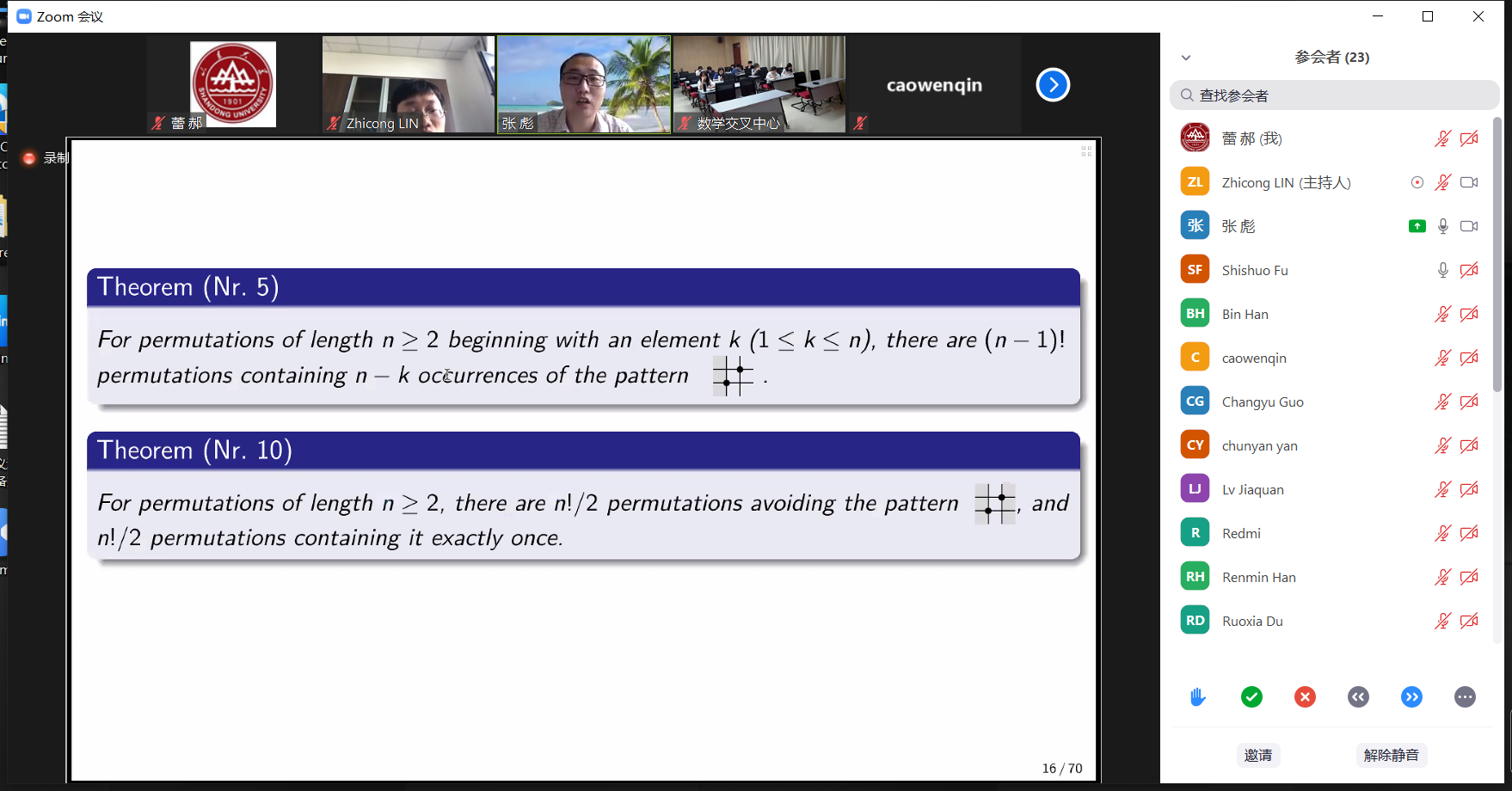 statistic and Catalan numbers”的精彩报告。报告介绍了他在反转数领域的最新研究成果,包括反转数的性质,反转数与欧拉数等组合对象的联系等,并介绍了自己在双向加权的Catalan numbers的研究计划,最后与参会者进行了交流。