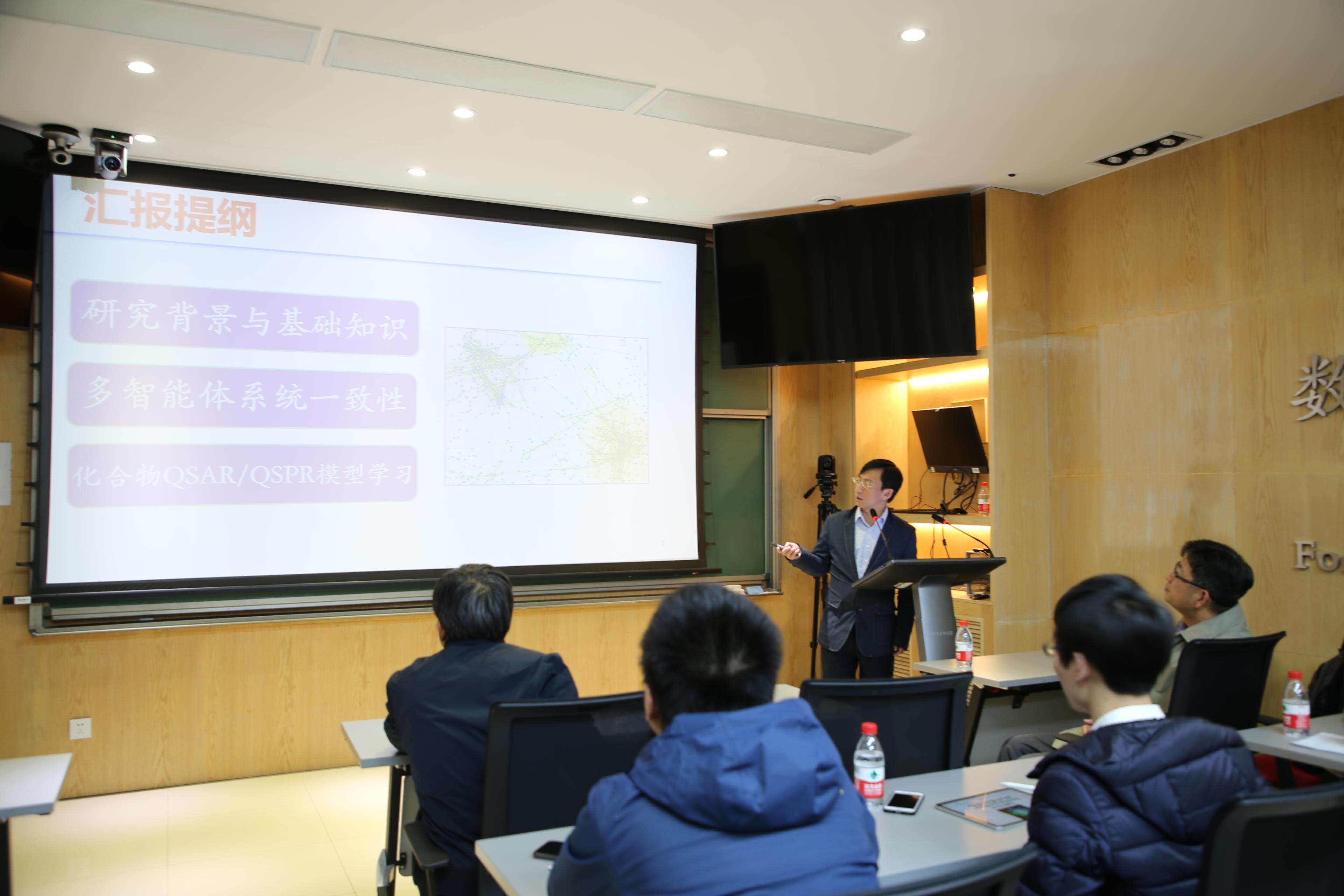 报告伊始,张焕水教授简要介绍了柴教授的个人研究方向和研究成果。随后,柴教授针对目前群体协作,分布式优化计算、智能电网调节、社交网络观念动力学等领域的研究热点,从图信号处理的基本概念和背景引入主题,从一致收敛性的物理本质、一致收敛率和网络拓扑的关系、最快收敛率等层面展开,深入浅出地讲解了自己在多自主体系统一致性控制方面的诸多研究成果。另外,柴教授还介绍了自己团队提出的基于图信号处理的新模型学习框架,用于解决现有方法不能有效区分具有相同图结构化合物的瓶颈问题。最后,老师们针对报告内容与柴教授就待解决问题、可行方法、领域交叉应用等方面展开了交流讨论,现场学术氛围浓厚。