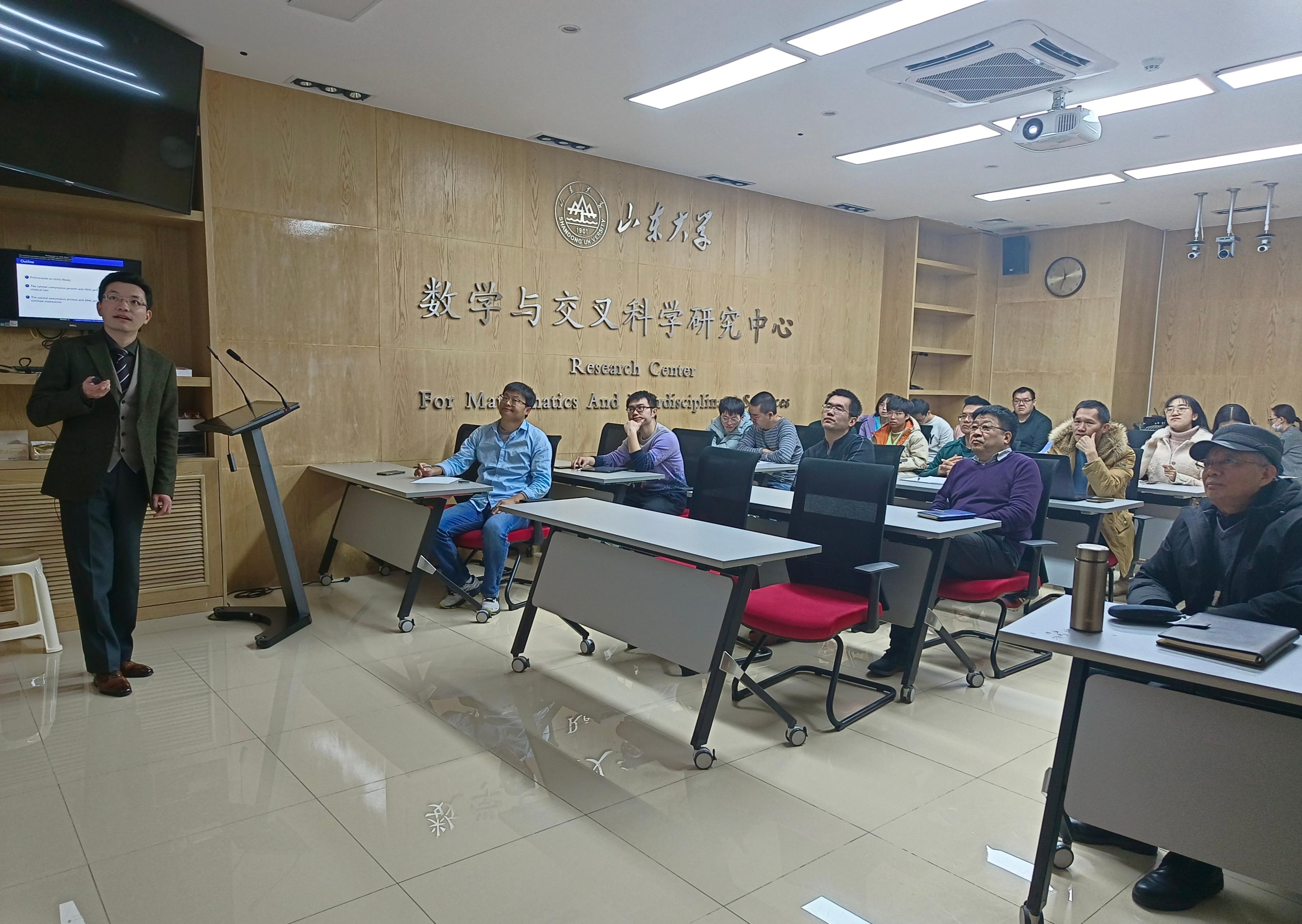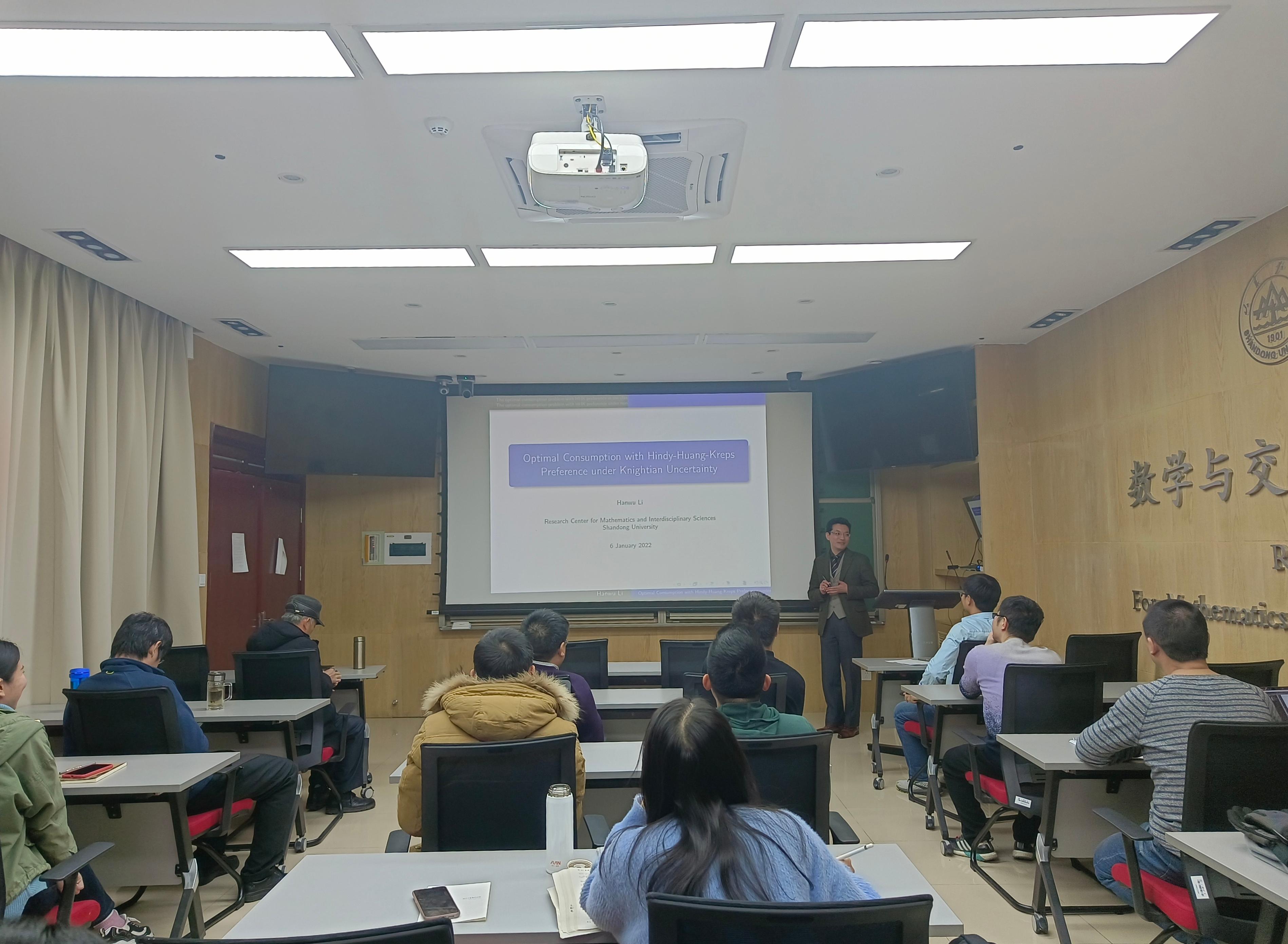 1月6日中午,taptap点点体育(以下简称“中心”)在华岗苑东楼119报告厅举办了第八期数苑午间学术沙龙活动,本期由taptap点点体育李邯武研究员进行题为《非线性期望下的HHK型最优消费问题》的学术报告。活动由中心宋健教授主持,中心全体教师及部分学生参与本次活动。