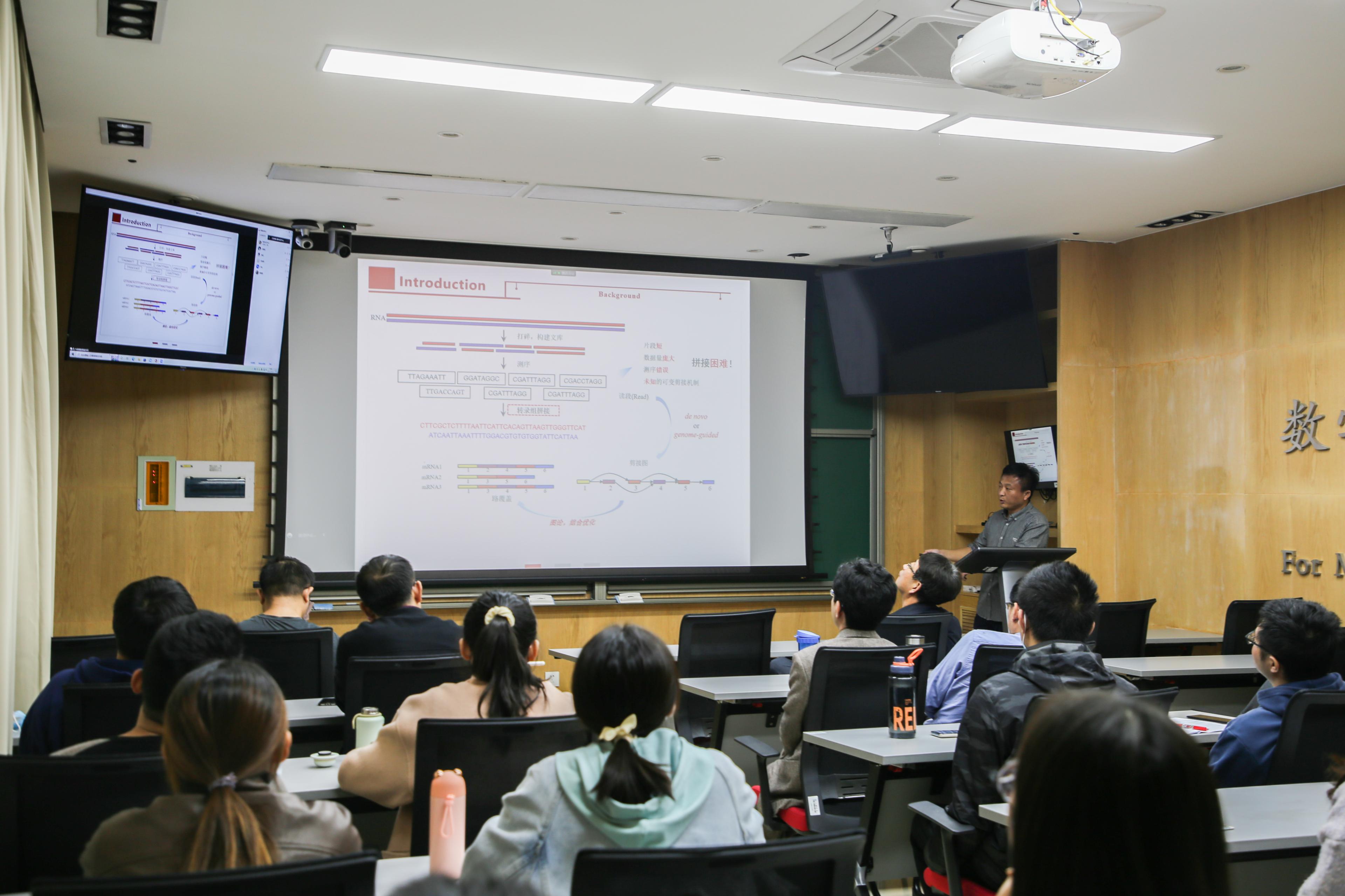 于婷副研究员以研究转录组组装的重大意义以及目前面临的重大挑战作为开场白,引出基于多样本RNA-seq数据的转录组组装算法—TransMeta,该算法可实现多个样本RAN-seq数据的同步精确组装。他详细介绍了TransMeta中引进的全新图模型——向量加权剪接图模型(Vector Weighted Splicing Graph Model),模型将转录组组装问题从一维推广到了高维。基于向量加权剪接图模型,TransMeta引进一个约束最优化问题实现了对剪接图的有效梳理,并以此来精确地重构转录本,得到很好的结果。报告最后,各位老师和同学积极讨论,提出许多引人深思的问题,于婷副研究员作了详细解答。