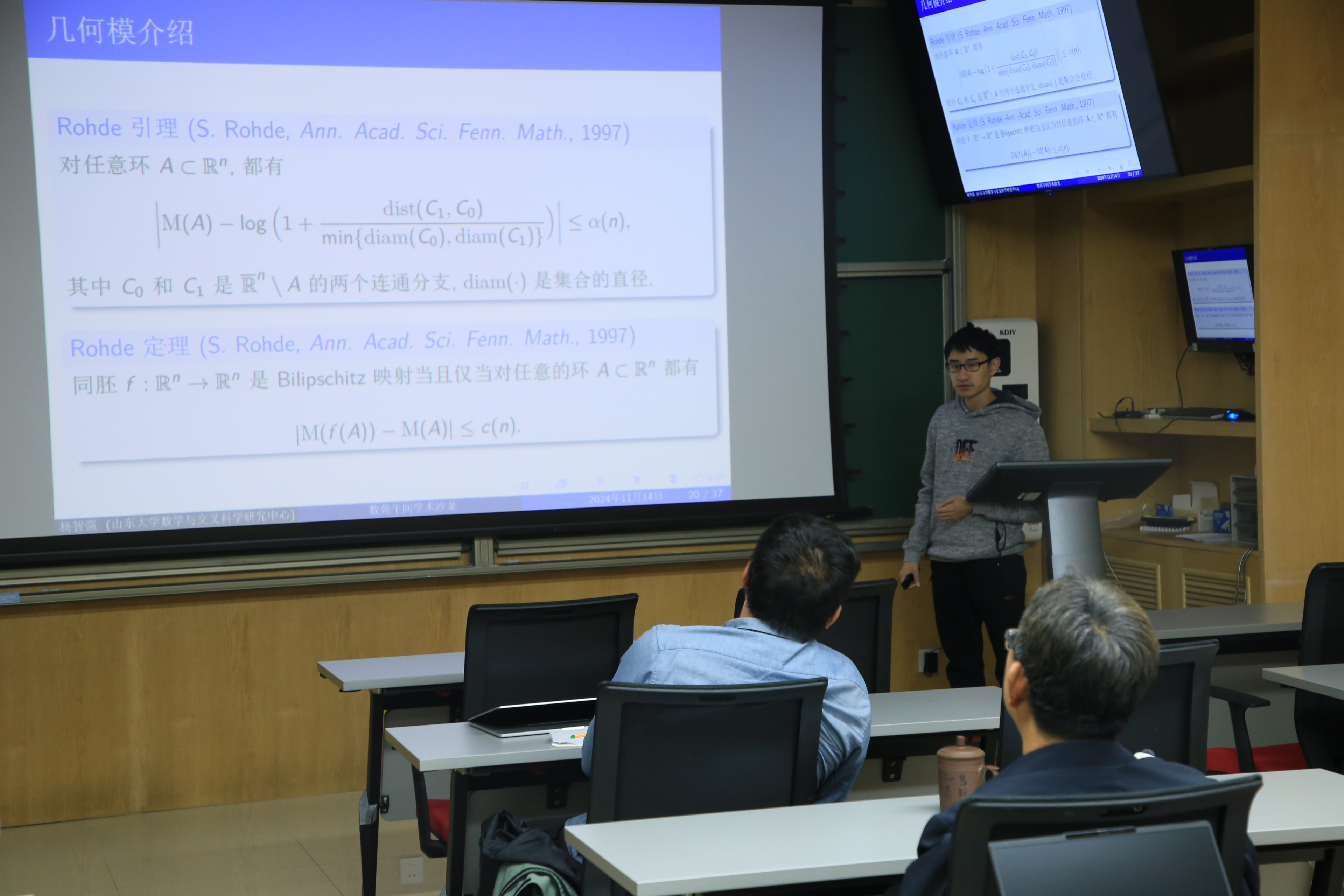 杨智强首先提出在无限维空间中无法定义曲线族的模,进而导致在自由拟共形映射理论中无法像欧氏空间那样定义几何刻画。随后,他对如何利用Tukia和Väisälä提出的几何模得到无限维Banach空间中自由拟共形映射的相应几何刻画进行了细致讲解,并利用以上结果改进了欧氏空间中拟共形映射的几何定义。