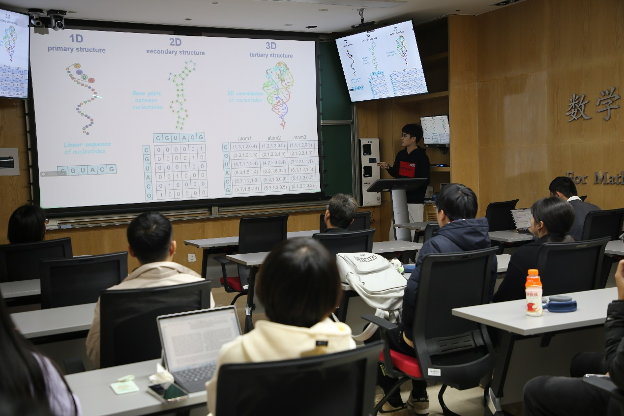 王文恺以近期蛋白质结构预测的突破引入主题,介绍了新的开发成果trRosettaRNA,并就预测精度展示了该算法的优越性。在提问环节,老师和同学们踊跃发言,王文恺对提出的问题进行了充分解答并与大家积极互动。